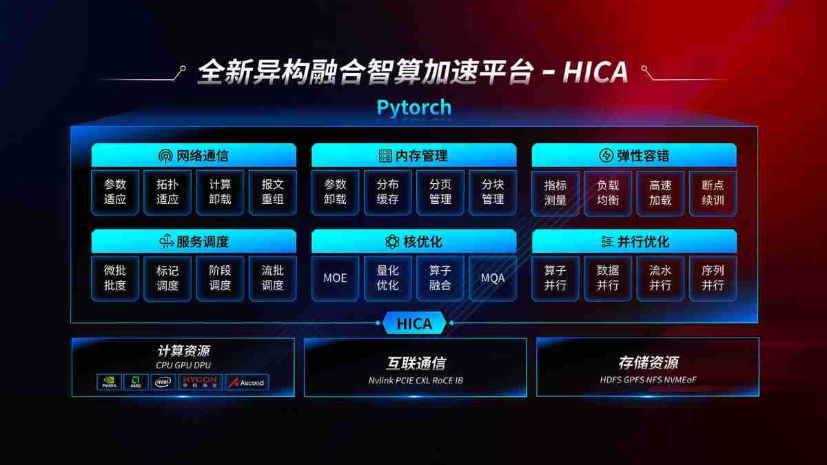 通过自研的服务层、、、中间适配层、、以及调度编排算法,,采用数据并行、、、、模型并行等多种并行方式,,,把并行计算任务进行有效的分解,,,使其分别由相应的软件栈和算力资源来承接。。。当GPU资源变化,,HICA可以实时动态调度计算子任务并调整模型拓扑和架构,,,,以充分聚合各种算力资源。。